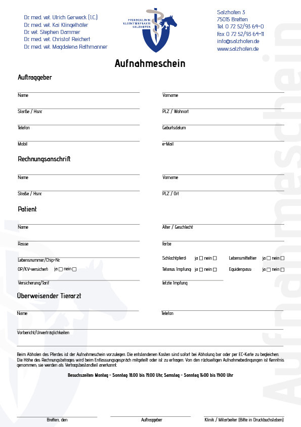 Bei einem stationären Aufenthalt Ihres Pferde bitten wir um die Begleichung der Rechnung bei Abholung Ihres Tieres. Hierbei haben sie die Möglichkeit zwischen zwei Zahlarten zu wählen, Bar oder EC‐Karte.
